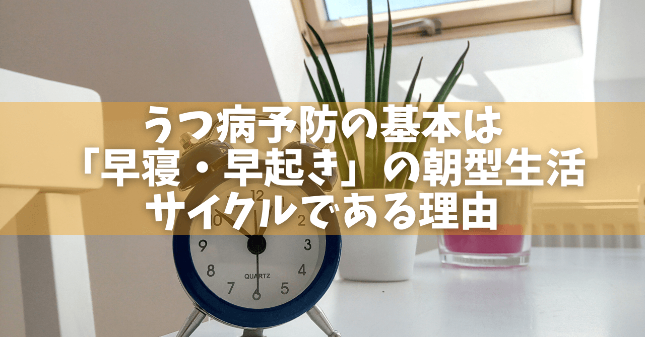 これらの理由から朝明るくなった時に目覚め、夜暗くなったら眠るという生き物として自然な生活リズムをおくるために 朝型生活をおすすめしているわけですが、特にうつ病予防という面から考えても朝型生活には大きなメリットがあります。