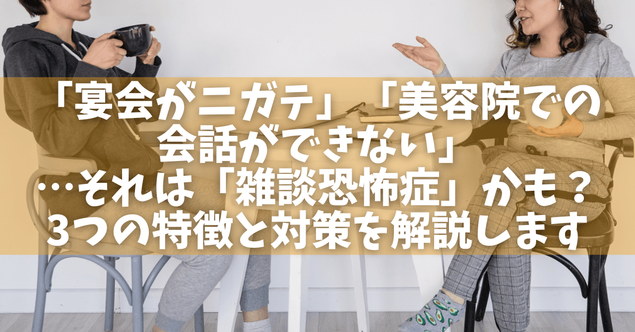 「忘年会や新年会で隣り合った人と何を話したらいいのかわからなくて、宴会の時期になると憂鬱」 「美容師さんと会話をするのがニガテで、美容院に行くのすらイヤ…」 天気の話やレジャーの話といった、いわゆる「雑談」と呼ばれるものが極端に苦手という人、意外と多いですよね。